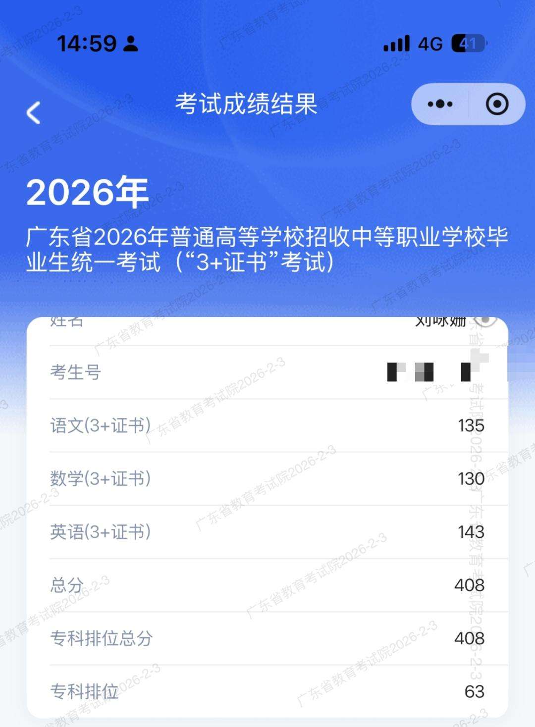 刘咏姗的“3+证书”考试成绩截图
