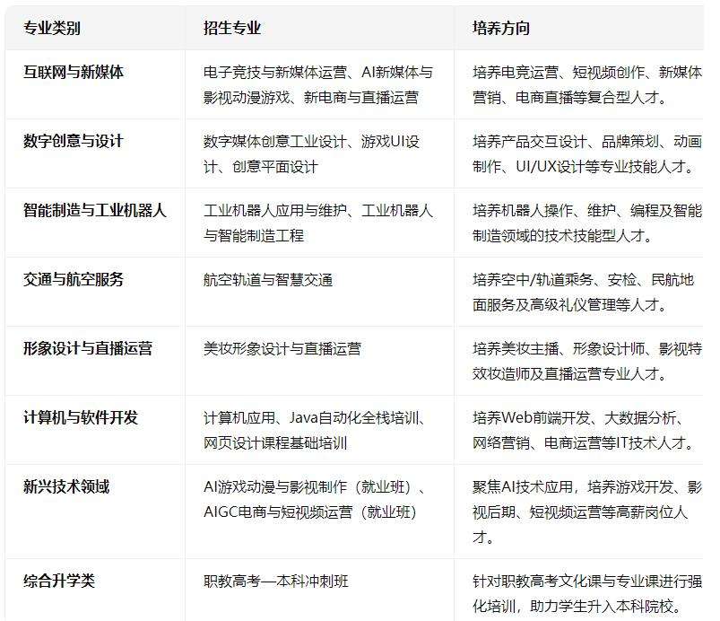 拥有“新媒体与电商、影视动漫游戏、电竞运营管理、短视频与直播、数字文创艺术、AI大数据、形象设计、高级乘务”八大产业技术实训中心,配备先进设备,确保学生掌握实操技能。