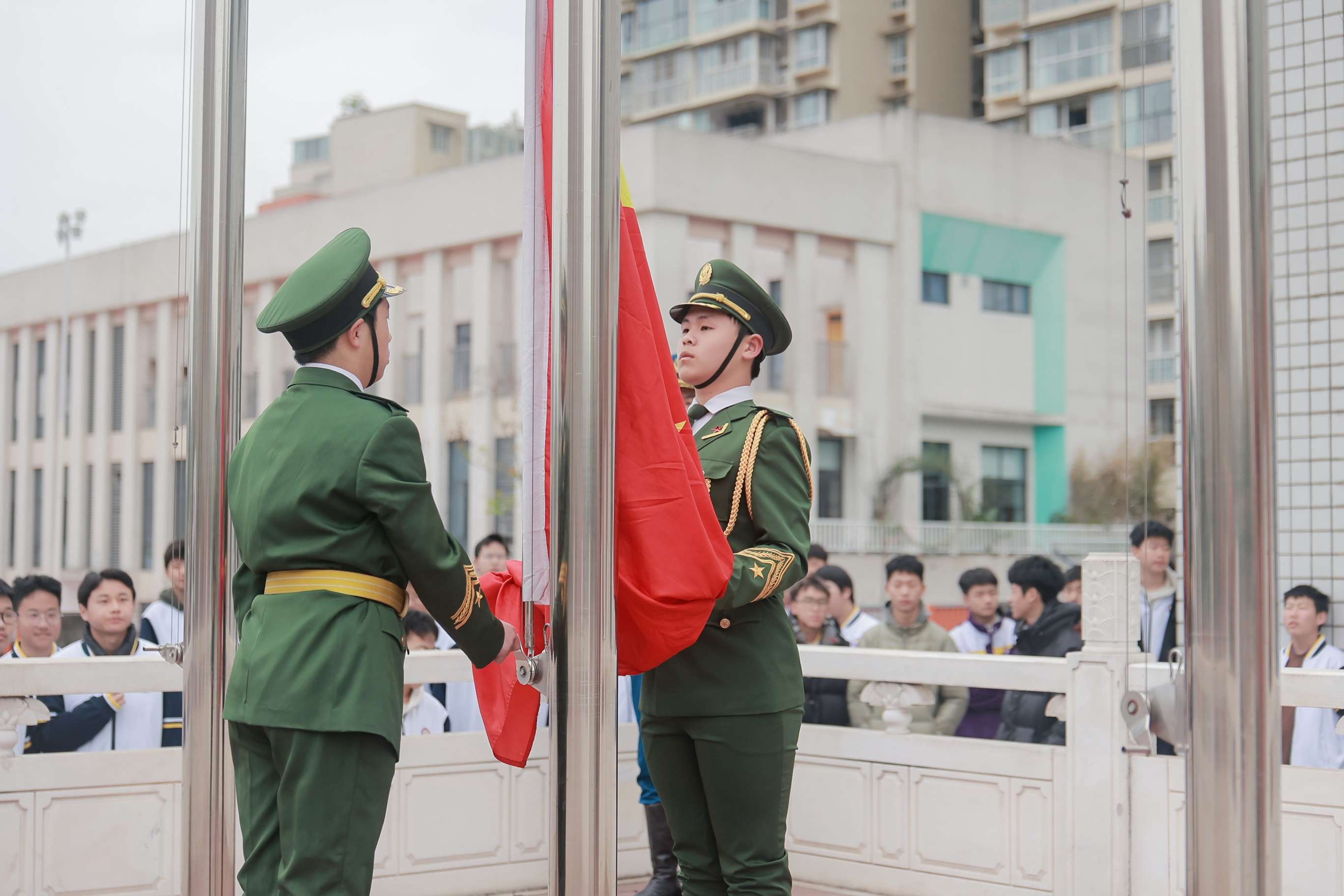 伴随着雄壮的国歌声,五星红旗冉冉升起。全体在场人员肃立注目,激昂的旋律回荡在校园上空。仰望国旗,学子们眼中满是崇敬与坚定。