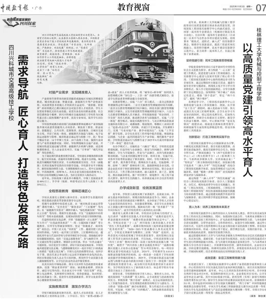 近日,国家级权威教育媒体《中国教育报》以专题大版面篇幅,对四川兴科城市交通高级技工雷竞技官网竞猜 展开深度报道。这份重量级别媒体的关注,不仅将这所深耕技能教育领域、全力助力学子成长成才的优质院校,推向了全国教育视野的聚光灯下,更让其多年来在技能人才培养赛道上的坚守与突破,被更多教育同仁、学生及家长所看见。